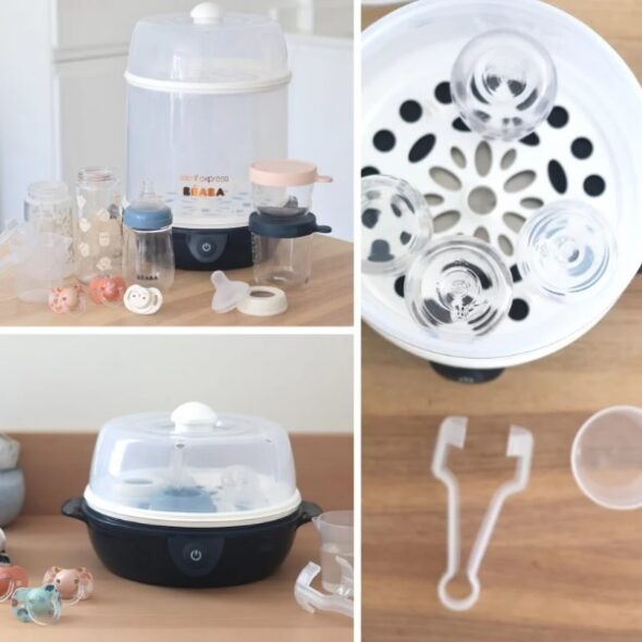 Sterilizatorul electric Beaba Steril Express Night Blue 2 în 1 este un dispozitiv evolutiv, conceput pentru a se adapta nevoilor zilnice ale părinților. Acesta dispune de două compartimente separate, unul mare, destinat biberoanelor și pompelor de sân, și un compartiment mini pentru accesorii precum suzete, tetine sau capace. Materialele utilizate sunt sigure pentru copii și nu conțin BPA. Sterilizatorul poate fi utilizat în modul Maxi, care permite sterilizarea a până la 9 biberoane standard sau 6 biberoane cu gât larg, sau în modul Mini, ideal pentru accesorii de dimensiuni mici. Procesul de sterilizare este foarte rapid, durează doar 6 minute și elimină peste 99,9% dintre bacterii, inclusiv salmonella, enterobacteriile și listeria. Aparatul se oprește automat la finalul ciclului și este compatibil cu toate tipurile de biberoane. În plus, este livrat cu clești speciali și o cupă dozatoare pentru apă, iar cablul electric detașabil facilitează depozitarea.