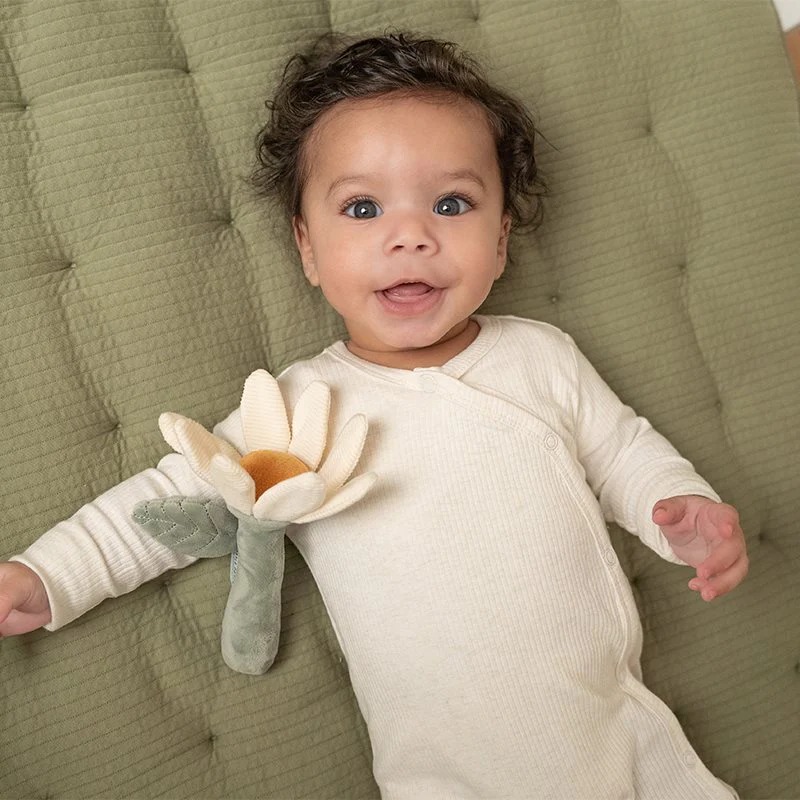 Ce adorabilă este această zornăitoare în formă de floare din colecția Little Farm! Când este mișcată, produce un sunet plăcut, iar petalele ascund o textură interesantă. Stimulează coordonarea mână–ochi, este moale și ușor de prins de mâinile mici.