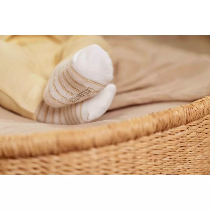 Acest set de șosete pentru bebeluși din bumbac organic de la Little Dutch oferă confort, protecție și delicatețe pentru pielea sensibilă a celor mici. Setul conține trei perechi de șosete în nuanțe neutre și calde, ideale pentru purtare zilnică. Fiecare pereche are un design diferit: o pereche simplă, decorată cu broderie florală fină, o pereche cu dungi subțiri albe și galbene și o pereche într-o nuanță galbenă vibrantă, cu detalii albe la tiv. Șosetele sunt moi, plăcute la atingere și perfecte pentru completarea ținutelor bebelușului.