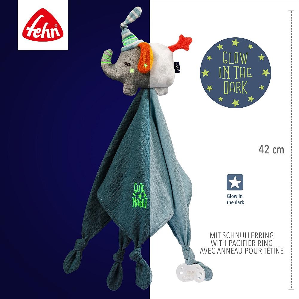 "Игрушечный слоник-плед из коллекции Good Night станет вашим компаньоном для сна и объятий. Маленький слоник обожает, когда его держат на руках, и становится верным другом для малышей дома или в дороге. Мягкий хлопковый муслин обеспечивает комфортный сон, а светящиеся элементы уменьшают боязнь темноты. Маленький слоник и его выпуклые головки побуждают малыша хватать, трогать и обнимать, а держатель для соски позволяет держать соску под рукой.