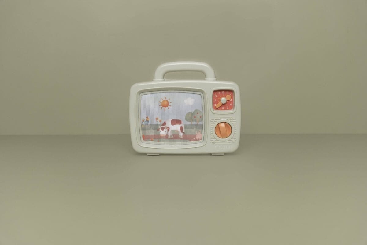 Музыкальный телевизор Little Dutch: при вращении ручки изображение меняется и звучит весёлая музыка. С изображениями фермерских животных, выполнен из пластика, подходит детям от 12 месяцев. Размеры: 19 × 23 × 4 см.