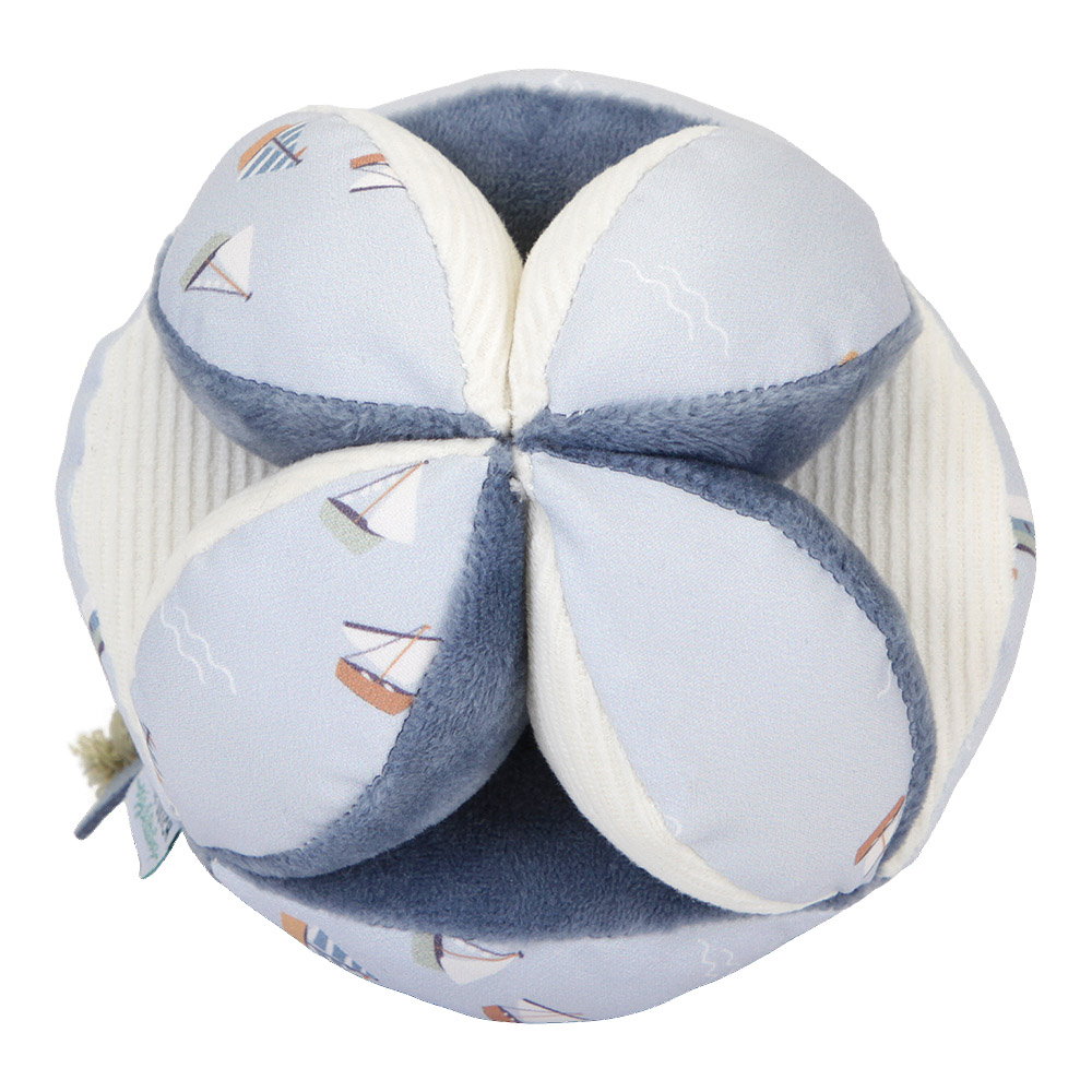 Этот сенсорный мяч с необычной формой и приятным звоном сразу привлечёт внимание вашего малыша и станет увлекательным вызовом для него. Детям понравится хватать мячик маленькими ручками, трясти его, бросать, перекатывать и наблюдать, куда он катится.Благодаря множеству удобных мест для захвата, разнообразным текстурам и узорам, мяч стимулирует органы чувств, развивает хватательный рефлекс и надолго увлекает ребёнка. Украшенный рисунками и цветами из коллекции Sailors Bay от Little Dutch, mячик легко держать и поднимать, а нежный звук внутри будет радовать малыша при каждом движении.